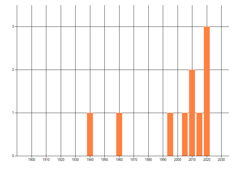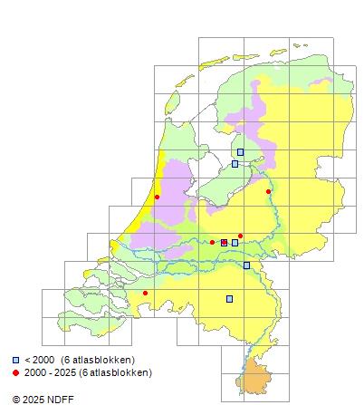 Het aantal atlasblokken (5x5 km) waarin de soort is gemeld binnen een periode van vijf jaar (vanaf 1980) of twintig jaar. Niet gecorrigeerd voor waarnemersinspanning en het aantal doorgegeven waarnemingen kan sterk variëren per periode, dus een trend in verspreiding kan hier niet direct uit worden afgelezen. Het opgegeven jaartal is het eerste jaar van de periode. Bron: gevalideerde waarnemingen uit de NDFF.