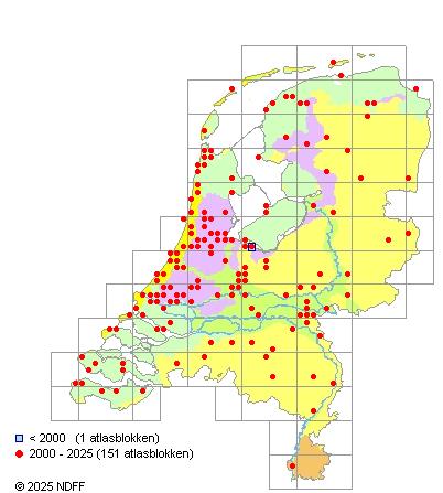 Het aantal atlasblokken (5x5 km) waarin de soort is gemeld binnen een periode van vijf jaar (vanaf 1980) of twintig jaar. Niet gecorrigeerd voor waarnemersinspanning en het aantal doorgegeven waarnemingen kan sterk variëren per periode, dus een trend in verspreiding kan hier niet direct uit worden afgelezen. Het opgegeven jaartal is het eerste jaar van de periode. Bron: gevalideerde waarnemingen uit de NDFF.