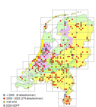 Het aantal atlasblokken (5x5 km) waarin de soort is gemeld binnen een periode van vijf jaar (vanaf 1980) of twintig jaar. Niet gecorrigeerd voor waarnemersinspanning en het aantal doorgegeven waarnemingen kan sterk variëren per periode, dus een trend in verspreiding kan hier niet direct uit worden afgelezen. Het opgegeven jaartal is het eerste jaar van de periode. Bron: gevalideerde waarnemingen uit de NDFF.