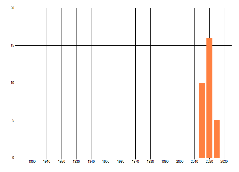 Het aantal atlasblokken (5x5 km) waarin de soort is gemeld binnen een periode van vijf jaar (vanaf 1980) of twintig jaar. Niet gecorrigeerd voor waarnemersinspanning en het aantal doorgegeven waarnemingen kan sterk variëren per periode, dus een trend in verspreiding kan hier niet direct uit worden afgelezen. Het opgegeven jaartal is het eerste jaar van de periode. Bron: gevalideerde waarnemingen uit de NDFF.