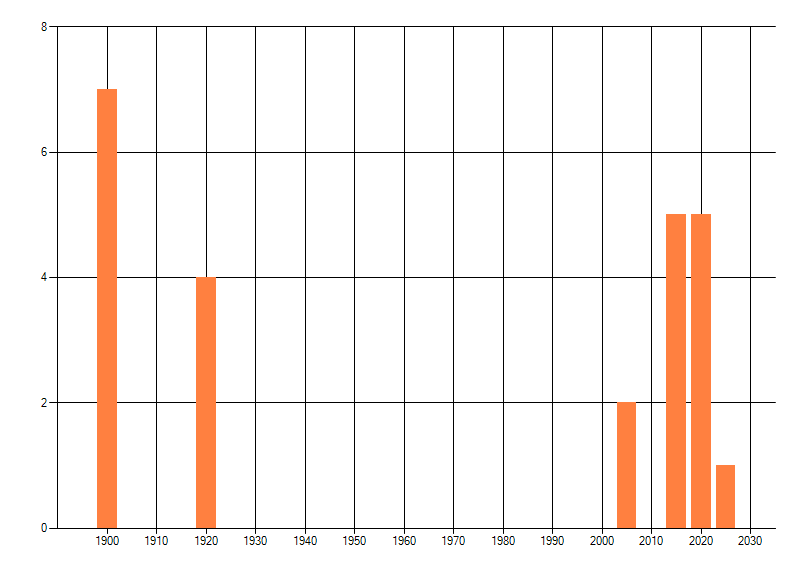 Het aantal atlasblokken (5x5 km) waarin de soort is gemeld binnen een periode van vijf jaar (vanaf 1980) of twintig jaar. Niet gecorrigeerd voor waarnemersinspanning en het aantal doorgegeven waarnemingen kan sterk variëren per periode, dus een trend in verspreiding kan hier niet direct uit worden afgelezen. Het opgegeven jaartal is het eerste jaar van de periode. Bron: gevalideerde waarnemingen uit de NDFF.