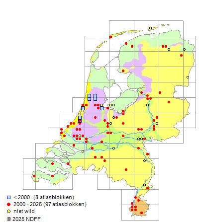 Het aantal atlasblokken (5x5 km) waarin de soort is gemeld binnen een periode van vijf jaar (vanaf 1980) of twintig jaar. Niet gecorrigeerd voor waarnemersinspanning en het aantal doorgegeven waarnemingen kan sterk variëren per periode, dus een trend in verspreiding kan hier niet direct uit worden afgelezen. Het opgegeven jaartal is het eerste jaar van de periode. Bron: gevalideerde waarnemingen uit de NDFF.