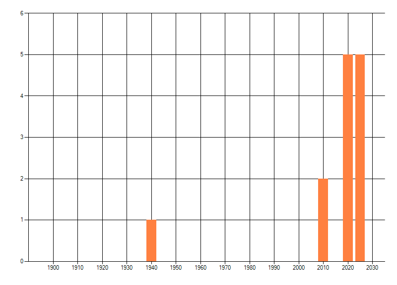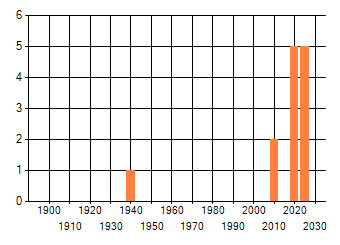 Het aantal atlasblokken (5x5 km) waarin de soort is gemeld binnen een periode van vijf jaar (vanaf 1980) of twintig jaar. Niet gecorrigeerd voor waarnemersinspanning en het aantal doorgegeven waarnemingen kan sterk variëren per periode, dus een trend in verspreiding kan hier niet direct uit worden afgelezen. Het opgegeven jaartal is het eerste jaar van de periode. Bron: gevalideerde waarnemingen uit de NDFF.