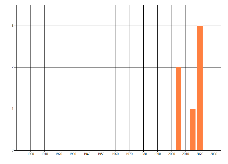 Het aantal atlasblokken (5x5 km) waarin de soort is gemeld binnen een periode van vijf jaar (vanaf 1980) of twintig jaar. Niet gecorrigeerd voor waarnemersinspanning en het aantal doorgegeven waarnemingen kan sterk variëren per periode, dus een trend in verspreiding kan hier niet direct uit worden afgelezen. Het opgegeven jaartal is het eerste jaar van de periode. Bron: gevalideerde waarnemingen uit de NDFF.