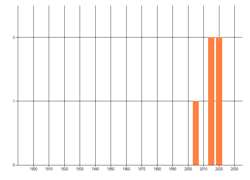Het aantal atlasblokken (5x5 km) waarin de soort is gemeld binnen een periode van vijf jaar (vanaf 1980) of twintig jaar. Niet gecorrigeerd voor waarnemersinspanning en het aantal doorgegeven waarnemingen kan sterk variëren per periode, dus een trend in verspreiding kan hier niet direct uit worden afgelezen. Het opgegeven jaartal is het eerste jaar van de periode. Bron: gevalideerde waarnemingen uit de NDFF.