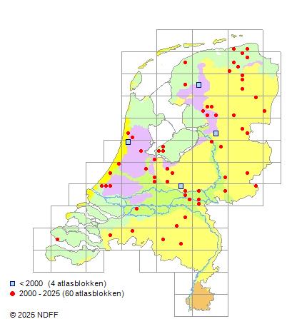 Het aantal atlasblokken (5x5 km) waarin de soort is gemeld binnen een periode van vijf jaar (vanaf 1980) of twintig jaar. Niet gecorrigeerd voor waarnemersinspanning en het aantal doorgegeven waarnemingen kan sterk variëren per periode, dus een trend in verspreiding kan hier niet direct uit worden afgelezen. Het opgegeven jaartal is het eerste jaar van de periode. Bron: gevalideerde waarnemingen uit de NDFF.