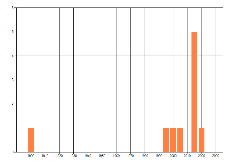 Het aantal atlasblokken (5x5 km) waarin de soort is gemeld binnen een periode van vijf jaar (vanaf 1980) of twintig jaar. Niet gecorrigeerd voor waarnemersinspanning en het aantal doorgegeven waarnemingen kan sterk variëren per periode, dus een trend in verspreiding kan hier niet direct uit worden afgelezen. Het opgegeven jaartal is het eerste jaar van de periode. Bron: gevalideerde waarnemingen uit de NDFF.