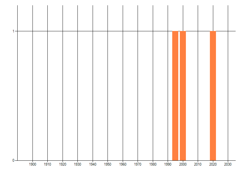 Het aantal atlasblokken (5x5 km) waarin de soort is gemeld binnen een periode van vijf jaar (vanaf 1980) of twintig jaar. Niet gecorrigeerd voor waarnemersinspanning en het aantal doorgegeven waarnemingen kan sterk variëren per periode, dus een trend in verspreiding kan hier niet direct uit worden afgelezen. Het opgegeven jaartal is het eerste jaar van de periode. Bron: gevalideerde waarnemingen uit de NDFF.