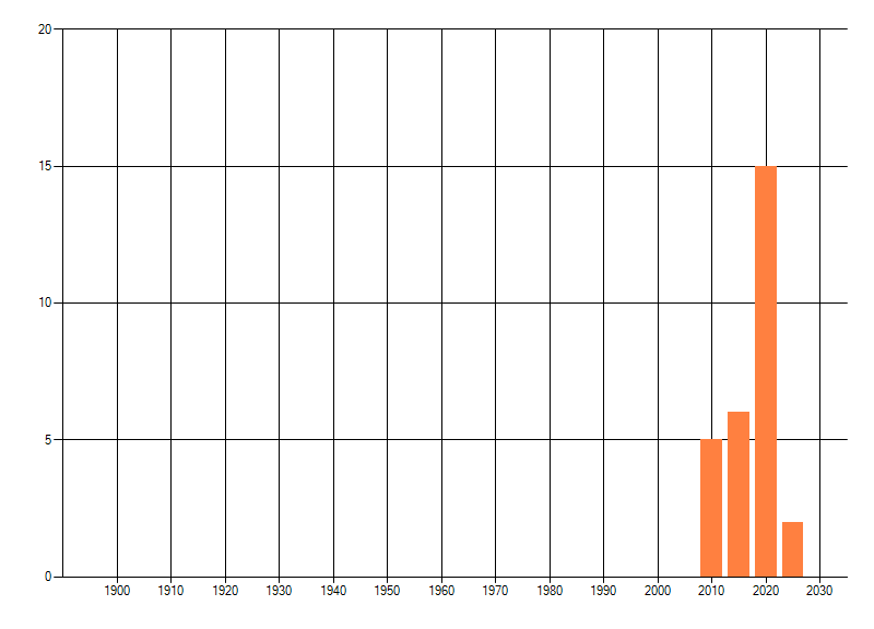 Het aantal atlasblokken (5x5 km) waarin de soort is gemeld binnen een periode van vijf jaar (vanaf 1980) of twintig jaar. Niet gecorrigeerd voor waarnemersinspanning en het aantal doorgegeven waarnemingen kan sterk variëren per periode, dus een trend in verspreiding kan hier niet direct uit worden afgelezen. Het opgegeven jaartal is het eerste jaar van de periode. Bron: gevalideerde waarnemingen uit de NDFF.