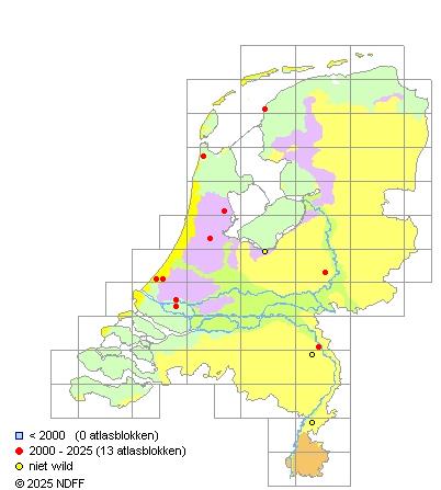 Het aantal atlasblokken (5x5 km) waarin de soort is gemeld binnen een periode van vijf jaar (vanaf 1980) of twintig jaar. Niet gecorrigeerd voor waarnemersinspanning en het aantal doorgegeven waarnemingen kan sterk variëren per periode, dus een trend in verspreiding kan hier niet direct uit worden afgelezen. Het opgegeven jaartal is het eerste jaar van de periode. Bron: gevalideerde waarnemingen uit de NDFF.