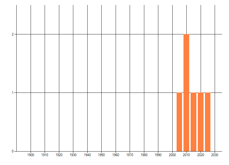 Het aantal atlasblokken (5x5 km) waarin de soort is gemeld binnen een periode van vijf jaar (vanaf 1980) of twintig jaar. Niet gecorrigeerd voor waarnemersinspanning en het aantal doorgegeven waarnemingen kan sterk variëren per periode, dus een trend in verspreiding kan hier niet direct uit worden afgelezen. Het opgegeven jaartal is het eerste jaar van de periode. Bron: gevalideerde waarnemingen uit de NDFF.