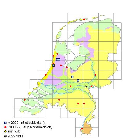Het aantal atlasblokken (5x5 km) waarin de soort is gemeld binnen een periode van vijf jaar (vanaf 1980) of twintig jaar. Niet gecorrigeerd voor waarnemersinspanning en het aantal doorgegeven waarnemingen kan sterk variëren per periode, dus een trend in verspreiding kan hier niet direct uit worden afgelezen. Het opgegeven jaartal is het eerste jaar van de periode. Bron: gevalideerde waarnemingen uit de NDFF.