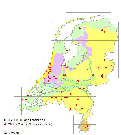 Het aantal atlasblokken (5x5 km) waarin de soort is gemeld binnen een periode van vijf jaar (vanaf 1980) of twintig jaar. Niet gecorrigeerd voor waarnemersinspanning en het aantal doorgegeven waarnemingen kan sterk variëren per periode, dus een trend in verspreiding kan hier niet direct uit worden afgelezen. Het opgegeven jaartal is het eerste jaar van de periode. Bron: gevalideerde waarnemingen uit de NDFF.