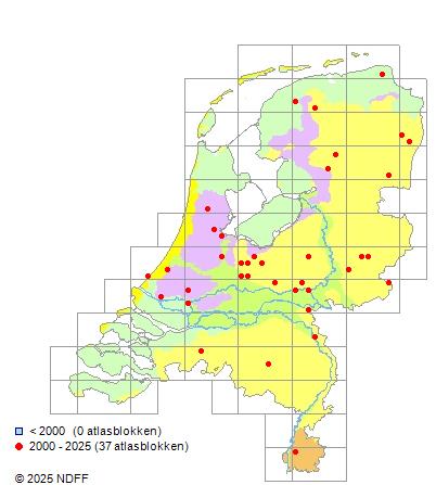 Het aantal atlasblokken (5x5 km) waarin de soort is gemeld binnen een periode van vijf jaar (vanaf 1980) of twintig jaar. Niet gecorrigeerd voor waarnemersinspanning en het aantal doorgegeven waarnemingen kan sterk variëren per periode, dus een trend in verspreiding kan hier niet direct uit worden afgelezen. Het opgegeven jaartal is het eerste jaar van de periode. Bron: gevalideerde waarnemingen uit de NDFF.