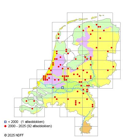 Het aantal atlasblokken (5x5 km) waarin de soort is gemeld binnen een periode van vijf jaar (vanaf 1980) of twintig jaar. Niet gecorrigeerd voor waarnemersinspanning en het aantal doorgegeven waarnemingen kan sterk variëren per periode, dus een trend in verspreiding kan hier niet direct uit worden afgelezen. Het opgegeven jaartal is het eerste jaar van de periode. Bron: gevalideerde waarnemingen uit de NDFF.