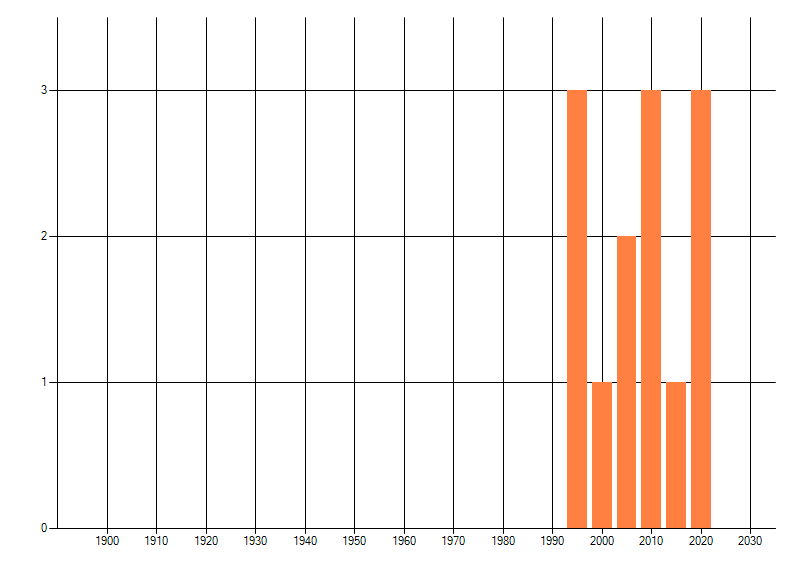 Het aantal atlasblokken (5x5 km) waarin de soort is gemeld binnen een periode van vijf jaar (vanaf 1980) of twintig jaar. Niet gecorrigeerd voor waarnemersinspanning en het aantal doorgegeven waarnemingen kan sterk variëren per periode, dus een trend in verspreiding kan hier niet direct uit worden afgelezen. Het opgegeven jaartal is het eerste jaar van de periode. Bron: gevalideerde waarnemingen uit de NDFF.