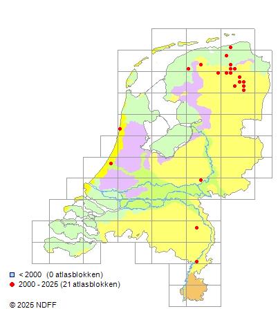Het aantal atlasblokken (5x5 km) waarin de soort is gemeld binnen een periode van vijf jaar (vanaf 1980) of twintig jaar. Niet gecorrigeerd voor waarnemersinspanning en het aantal doorgegeven waarnemingen kan sterk variëren per periode, dus een trend in verspreiding kan hier niet direct uit worden afgelezen. Het opgegeven jaartal is het eerste jaar van de periode. Bron: gevalideerde waarnemingen uit de NDFF.