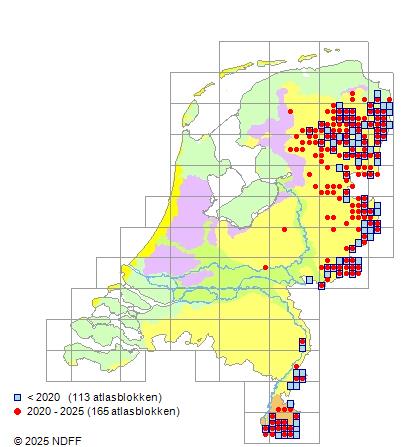 Het aantal atlasblokken (5x5 km) waarin de soort is gemeld binnen een periode van vijf jaar (vanaf 1980) of twintig jaar.