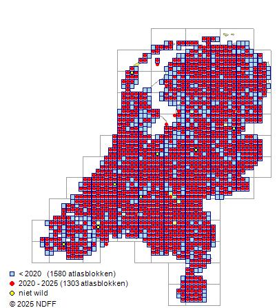 Het aantal atlasblokken (5x5 km) waarin de soort is gemeld binnen een periode van vijf jaar (vanaf 1980) of twintig jaar.