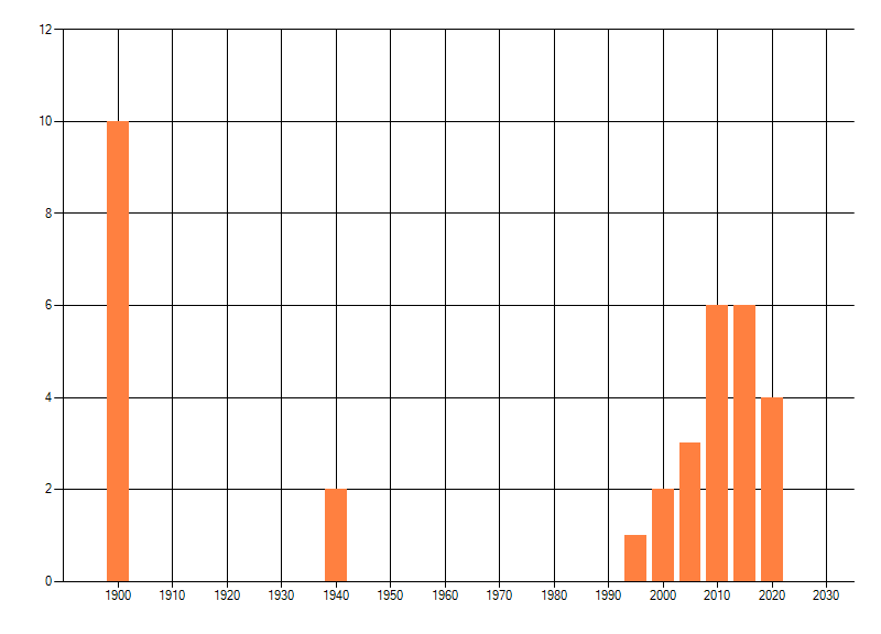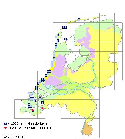 Het aantal atlasblokken (5x5 km) waarin de soort is gemeld binnen een periode van vijf jaar (vanaf 1980) of twintig jaar. Niet gecorrigeerd voor waarnemersinspanning en het aantal doorgegeven waarnemingen kan sterk variëren per periode, dus een trend in verspreiding kan hier niet direct uit worden afgelezen. Het opgegeven jaartal is het eerste jaar van de periode. Bron: gevalideerde waarnemingen uit de NDFF.