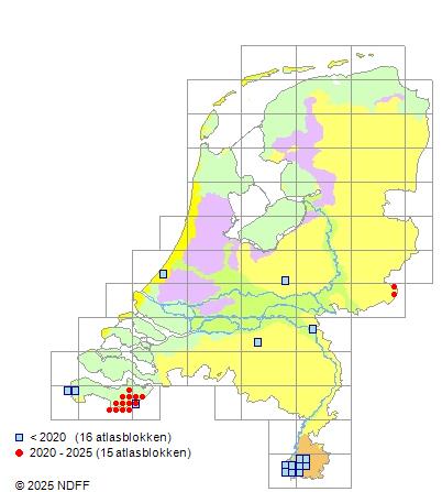 Het aantal atlasblokken (5x5 km) waarin de soort is gemeld binnen een periode van vijf jaar (vanaf 1980) of twintig jaar.