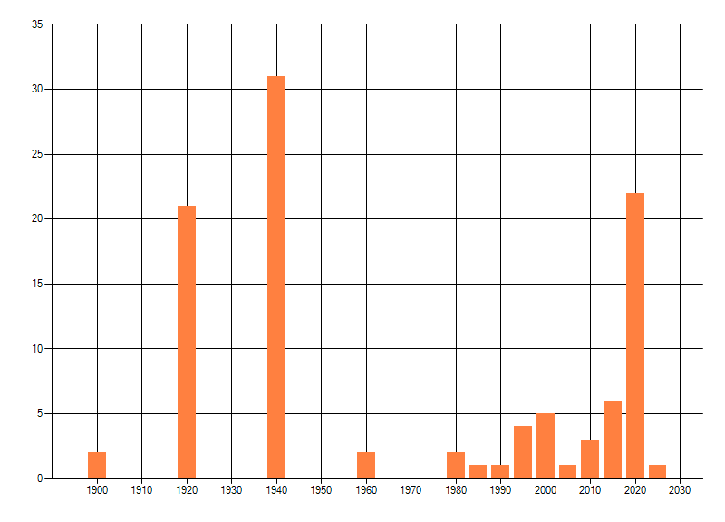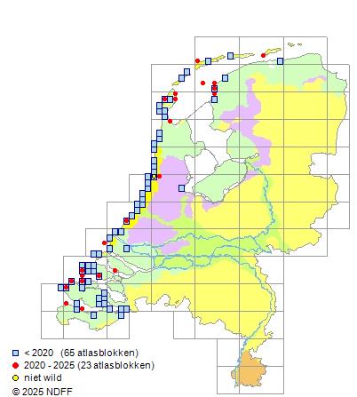 Het aantal atlasblokken (5x5 km) waarin de soort is gemeld binnen een periode van vijf jaar (vanaf 1980) of twintig jaar. Niet gecorrigeerd voor waarnemersinspanning en het aantal doorgegeven waarnemingen kan sterk variëren per periode, dus een trend in verspreiding kan hier niet direct uit worden afgelezen. Het opgegeven jaartal is het eerste jaar van de periode. Bron: gevalideerde waarnemingen uit de NDFF.