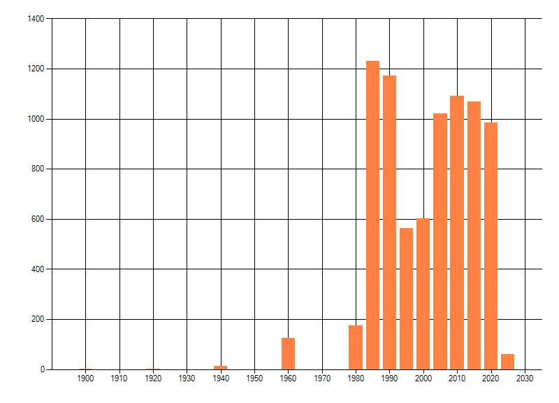 Het aantal atlasblokken (5x5 km) waarin de soort is gemeld binnen een periode van vijf jaar (vanaf 1980) of twintig jaar. Niet gecorrigeerd voor waarnemersinspanning en het aantal doorgegeven waarnemingen kan sterk variëren per periode, dus een trend in verspreiding kan hier niet direct uit worden afgelezen. Het opgegeven jaartal is het eerste jaar van de periode. Bron: gevalideerde waarnemingen uit de NDFF.