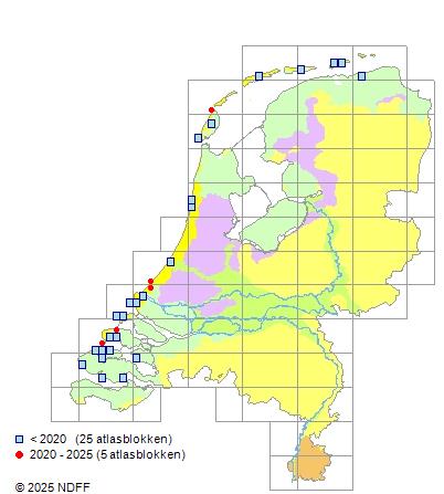 Het aantal atlasblokken (5x5 km) waarin de soort is gemeld binnen een periode van vijf jaar (vanaf 1980) of twintig jaar. Niet gecorrigeerd voor waarnemersinspanning en het aantal doorgegeven waarnemingen kan sterk variëren per periode, dus een trend in verspreiding kan hier niet direct uit worden afgelezen. Het opgegeven jaartal is het eerste jaar van de periode. Bron: gevalideerde waarnemingen uit de NDFF.