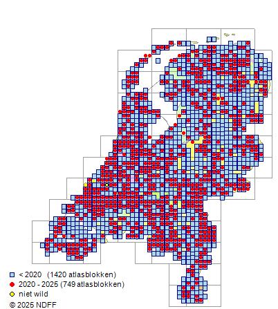 Het aantal atlasblokken (5x5 km) waarin de soort is gemeld binnen een periode van vijf jaar (vanaf 1980) of twintig jaar.