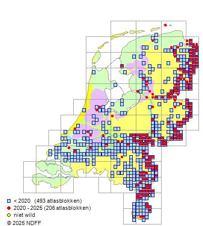 Het aantal atlasblokken (5x5 km) waarin de soort is gemeld binnen een periode van vijf jaar (vanaf 1980) of twintig jaar. Niet gecorrigeerd voor waarnemersinspanning en het aantal doorgegeven waarnemingen kan sterk variëren per periode, dus een trend in verspreiding kan hier niet direct uit worden afgelezen. Het opgegeven jaartal is het eerste jaar van de periode. Bron: gevalideerde waarnemingen uit de NDFF.