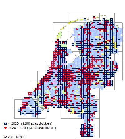 Het aantal atlasblokken (5x5 km) waarin de soort is gemeld binnen een periode van vijf jaar (vanaf 1980) of twintig jaar. Niet gecorrigeerd voor waarnemersinspanning en het aantal doorgegeven waarnemingen kan sterk variëren per periode, dus een trend in verspreiding kan hier niet direct uit worden afgelezen. Het opgegeven jaartal is het eerste jaar van de periode. Bron: gevalideerde waarnemingen uit de NDFF.
