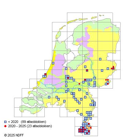 Het aantal atlasblokken (5x5 km) waarin de soort is gemeld binnen een periode van vijf jaar (vanaf 1980) of twintig jaar. Niet gecorrigeerd voor waarnemersinspanning en het aantal doorgegeven waarnemingen kan sterk variëren per periode, dus een trend in verspreiding kan hier niet direct uit worden afgelezen. Het opgegeven jaartal is het eerste jaar van de periode. Bron: gevalideerde waarnemingen uit de NDFF.
