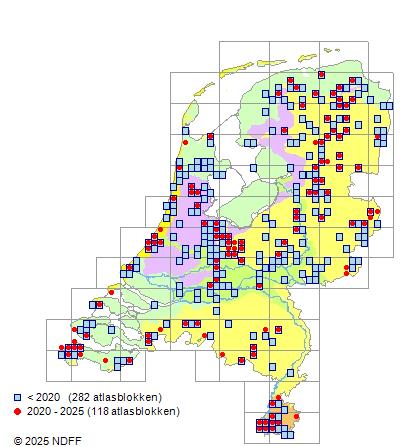 Het aantal atlasblokken (5x5 km) waarin de soort is gemeld binnen een periode van vijf jaar (vanaf 1980) of twintig jaar. Niet gecorrigeerd voor waarnemersinspanning en het aantal doorgegeven waarnemingen kan sterk variëren per periode, dus een trend in verspreiding kan hier niet direct uit worden afgelezen. Het opgegeven jaartal is het eerste jaar van de periode. Bron: gevalideerde waarnemingen uit de NDFF.