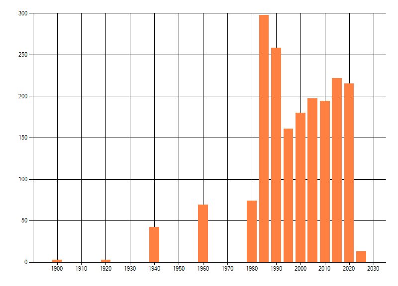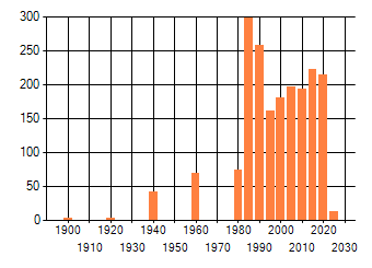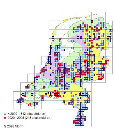 Het aantal atlasblokken (5x5 km) waarin de soort is gemeld binnen een periode van vijf jaar (vanaf 1980) of twintig jaar. Niet gecorrigeerd voor waarnemersinspanning en het aantal doorgegeven waarnemingen kan sterk variëren per periode, dus een trend in verspreiding kan hier niet direct uit worden afgelezen. Het opgegeven jaartal is het eerste jaar van de periode. Bron: gevalideerde waarnemingen uit de NDFF.