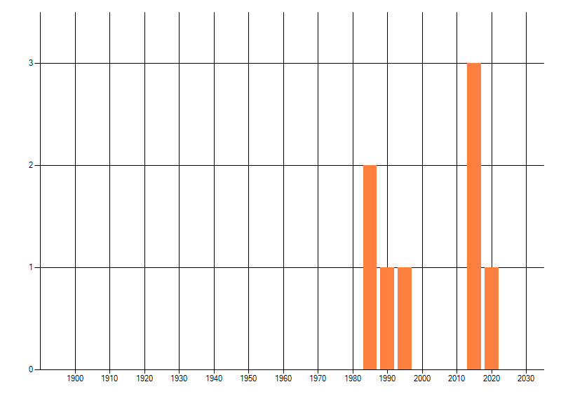 Het aantal atlasblokken (5x5 km) waarin de soort is gemeld binnen een periode van vijf jaar (vanaf 1980) of twintig jaar. Niet gecorrigeerd voor waarnemersinspanning en het aantal doorgegeven waarnemingen kan sterk variëren per periode, dus een trend in verspreiding kan hier niet direct uit worden afgelezen. Het opgegeven jaartal is het eerste jaar van de periode. Bron: gevalideerde waarnemingen uit de NDFF.