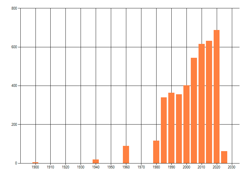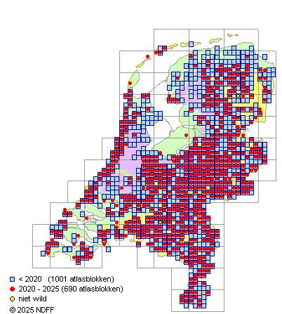 Het aantal atlasblokken (5x5 km) waarin de soort is gemeld binnen een periode van vijf jaar (vanaf 1980) of twintig jaar. Niet gecorrigeerd voor waarnemersinspanning en het aantal doorgegeven waarnemingen kan sterk variëren per periode, dus een trend in verspreiding kan hier niet direct uit worden afgelezen. Het opgegeven jaartal is het eerste jaar van de periode. Bron: gevalideerde waarnemingen uit de NDFF.