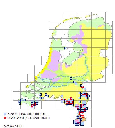 Het aantal atlasblokken (5x5 km) waarin de soort is gemeld binnen een periode van vijf jaar (vanaf 1980) of twintig jaar. Niet gecorrigeerd voor waarnemersinspanning en het aantal doorgegeven waarnemingen kan sterk variëren per periode, dus een trend in verspreiding kan hier niet direct uit worden afgelezen. Het opgegeven jaartal is het eerste jaar van de periode. Bron: gevalideerde waarnemingen uit de NDFF.