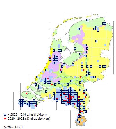 Het aantal atlasblokken (5x5 km) waarin de soort is gemeld binnen een periode van vijf jaar (vanaf 1980) of twintig jaar. Niet gecorrigeerd voor waarnemersinspanning en het aantal doorgegeven waarnemingen kan sterk variëren per periode, dus een trend in verspreiding kan hier niet direct uit worden afgelezen. Het opgegeven jaartal is het eerste jaar van de periode. Bron: gevalideerde waarnemingen uit de NDFF.