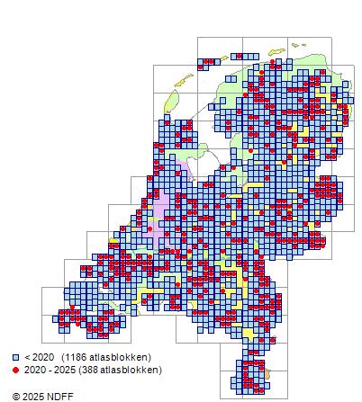 Het aantal atlasblokken (5x5 km) waarin de soort is gemeld binnen een periode van vijf jaar (vanaf 1980) of twintig jaar. Niet gecorrigeerd voor waarnemersinspanning en het aantal doorgegeven waarnemingen kan sterk variëren per periode, dus een trend in verspreiding kan hier niet direct uit worden afgelezen. Het opgegeven jaartal is het eerste jaar van de periode. Bron: gevalideerde waarnemingen uit de NDFF.