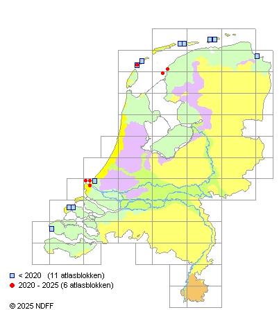 Het aantal atlasblokken (5x5 km) waarin de soort is gemeld binnen een periode van vijf jaar (vanaf 1980) of twintig jaar. Niet gecorrigeerd voor waarnemersinspanning en het aantal doorgegeven waarnemingen kan sterk variëren per periode, dus een trend in verspreiding kan hier niet direct uit worden afgelezen. Het opgegeven jaartal is het eerste jaar van de periode. Bron: gevalideerde waarnemingen uit de NDFF.