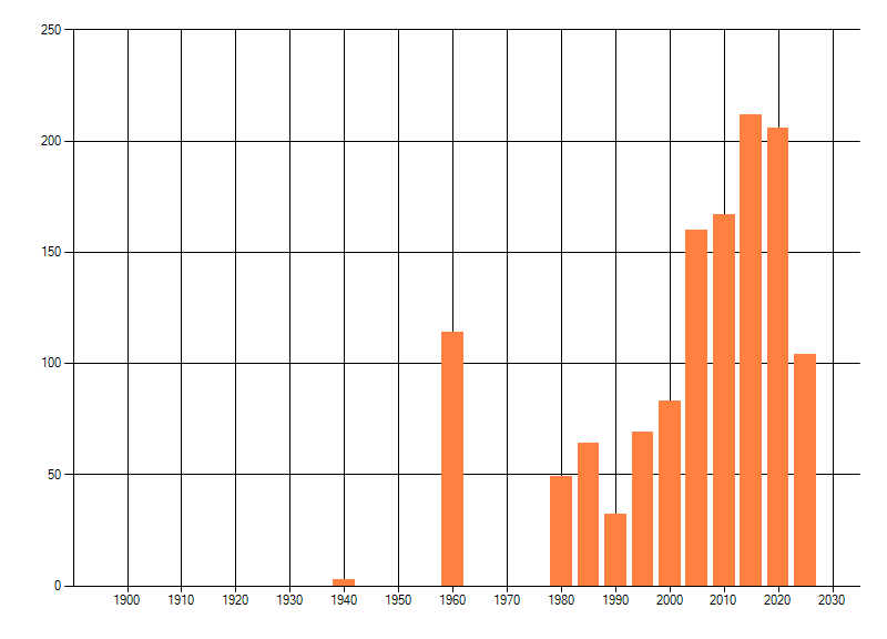 Het aantal atlasblokken (5x5 km) waarin de soort is gemeld binnen een periode van vijf jaar (vanaf 1980) of twintig jaar. Niet gecorrigeerd voor waarnemersinspanning en het aantal doorgegeven waarnemingen kan sterk variëren per periode, dus een trend in verspreiding kan hier niet direct uit worden afgelezen. Het opgegeven jaartal is het eerste jaar van de periode. Bron: gevalideerde waarnemingen uit de NDFF.