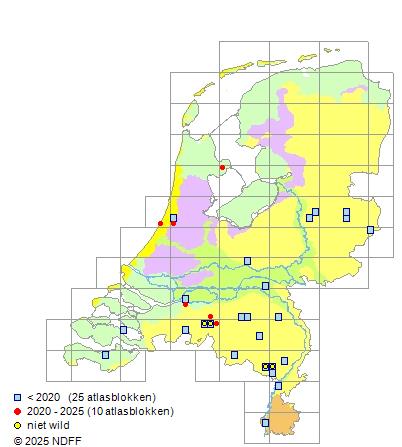 Het aantal atlasblokken (5x5 km) waarin de soort is gemeld binnen een periode van vijf jaar (vanaf 1980) of twintig jaar. Niet gecorrigeerd voor waarnemersinspanning en het aantal doorgegeven waarnemingen kan sterk variëren per periode, dus een trend in verspreiding kan hier niet direct uit worden afgelezen. Het opgegeven jaartal is het eerste jaar van de periode. Bron: gevalideerde waarnemingen uit de NDFF.