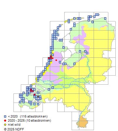 Het aantal atlasblokken (5x5 km) waarin de soort is gemeld binnen een periode van vijf jaar (vanaf 1980) of twintig jaar. Niet gecorrigeerd voor waarnemersinspanning en het aantal doorgegeven waarnemingen kan sterk variëren per periode, dus een trend in verspreiding kan hier niet direct uit worden afgelezen. Het opgegeven jaartal is het eerste jaar van de periode. Bron: gevalideerde waarnemingen uit de NDFF.