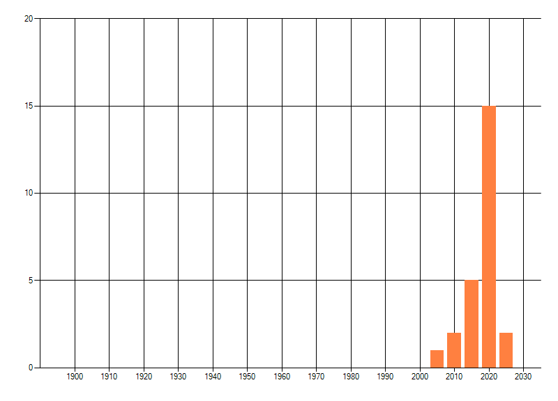 Het aantal atlasblokken (5x5 km) waarin de soort is gemeld binnen een periode van vijf jaar (vanaf 1980) of twintig jaar. Niet gecorrigeerd voor waarnemersinspanning en het aantal doorgegeven waarnemingen kan sterk variëren per periode, dus een trend in verspreiding kan hier niet direct uit worden afgelezen. Het opgegeven jaartal is het eerste jaar van de periode. Bron: gevalideerde waarnemingen uit de NDFF.