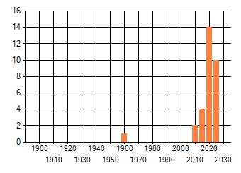 Het aantal atlasblokken (5x5 km) waarin de soort is gemeld binnen een periode van vijf jaar (vanaf 1980) of twintig jaar. Niet gecorrigeerd voor waarnemersinspanning en het aantal doorgegeven waarnemingen kan sterk variëren per periode, dus een trend in verspreiding kan hier niet direct uit worden afgelezen. Het opgegeven jaartal is het eerste jaar van de periode. Bron: gevalideerde waarnemingen uit de NDFF.