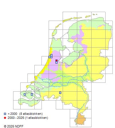 Het aantal atlasblokken (5x5 km) waarin de soort is gemeld binnen een periode van vijf jaar (vanaf 1980) of twintig jaar. Niet gecorrigeerd voor waarnemersinspanning en het aantal doorgegeven waarnemingen kan sterk variëren per periode, dus een trend in verspreiding kan hier niet direct uit worden afgelezen. Het opgegeven jaartal is het eerste jaar van de periode. Bron: gevalideerde waarnemingen uit de NDFF.