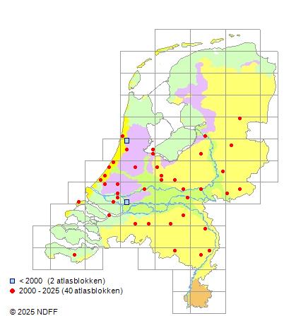Het aantal atlasblokken (5x5 km) waarin de soort is gemeld binnen een periode van vijf jaar (vanaf 1980) of twintig jaar. Niet gecorrigeerd voor waarnemersinspanning en het aantal doorgegeven waarnemingen kan sterk variëren per periode, dus een trend in verspreiding kan hier niet direct uit worden afgelezen. Het opgegeven jaartal is het eerste jaar van de periode. Bron: gevalideerde waarnemingen uit de NDFF.