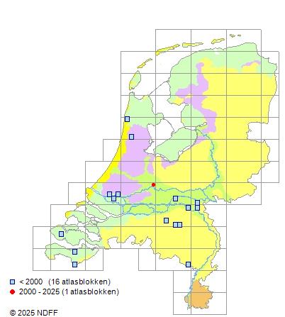 Het aantal atlasblokken (5x5 km) waarin de soort is gemeld binnen een periode van vijf jaar (vanaf 1980) of twintig jaar. Niet gecorrigeerd voor waarnemersinspanning en het aantal doorgegeven waarnemingen kan sterk variëren per periode, dus een trend in verspreiding kan hier niet direct uit worden afgelezen. Het opgegeven jaartal is het eerste jaar van de periode. Bron: gevalideerde waarnemingen uit de NDFF.
