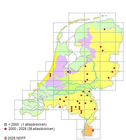 Het aantal atlasblokken (5x5 km) waarin de soort is gemeld binnen een periode van vijf jaar (vanaf 1980) of twintig jaar. Niet gecorrigeerd voor waarnemersinspanning en het aantal doorgegeven waarnemingen kan sterk variëren per periode, dus een trend in verspreiding kan hier niet direct uit worden afgelezen. Het opgegeven jaartal is het eerste jaar van de periode. Bron: gevalideerde waarnemingen uit de NDFF.