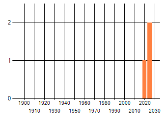 Het aantal atlasblokken (5x5 km) waarin de soort is gemeld binnen een periode van vijf jaar (vanaf 1980) of twintig jaar. Niet gecorrigeerd voor waarnemersinspanning en het aantal doorgegeven waarnemingen kan sterk variëren per periode, dus een trend in verspreiding kan hier niet direct uit worden afgelezen. Het opgegeven jaartal is het eerste jaar van de periode. Bron: gevalideerde waarnemingen uit de NDFF.